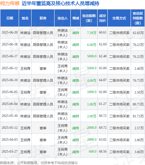 证券之星消息,根据6月23日市场公开信息、上市公司公告及交易所披露数据整理,柯力传感(603662)最新董监高及相关人员股份变动情况:2025年6月20日公司高级管理人员林德法共减持公司股份7.39万股,占公司总股本为0.0262%。变动期间公司股价下跌3.29%,6月20日当日收盘报60.24元。